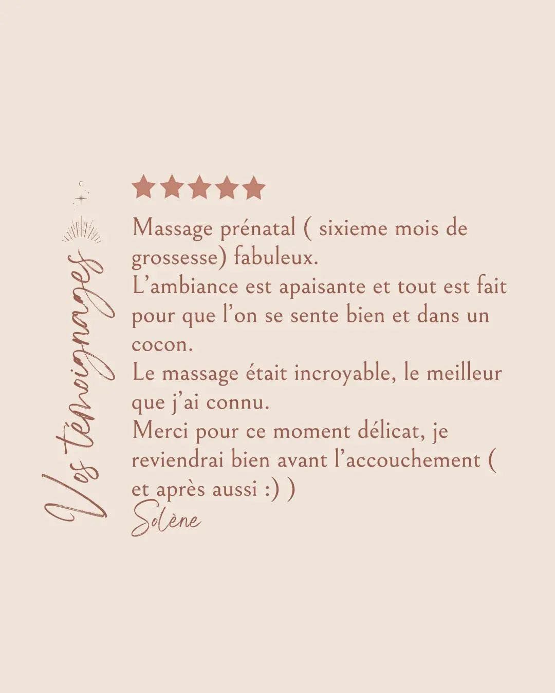 Quand j'ai lu "une heure de massage équivaut à 8h de sommeil" sur le site, j'avoue avoir été sceptique mais le fait est que le massage d’Aurélie a été magique, l'équivalent de plusieurs nuits de sommeil même ! Un moment hors du temps qui m'a vraiment remise sur pied. Merci beaucoup et à très très vite !