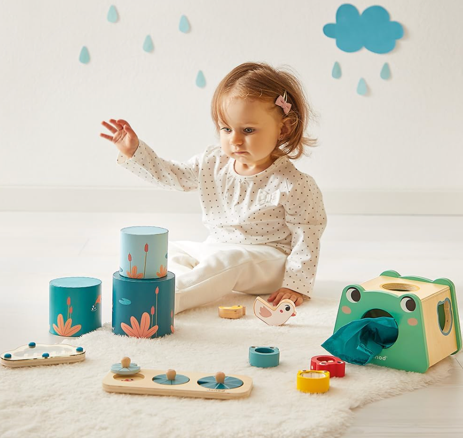 L’enfant devient plus actif : il rampe, se tient assis et peut commencer à se mettre debout avec appui. Il développe sa motricité fine et son sens de la coordination. Les jeux qui impliquent de saisir, empiler, pousser ou tirer sont parfaits pour ce stade.