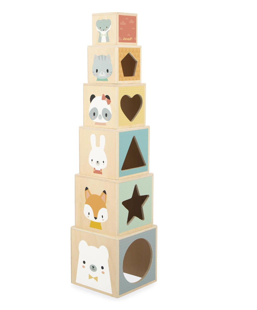 - Cubes ou anneaux à empiler – motricité fine, compréhension des tailles/couleurs.
